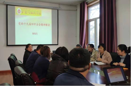 2019年11月14日上午,beat365会员官方网站党副院长兼教授委员会办公室主任杨包生为学院教工第一党支部全体党员在学院办公楼一楼会议室进行“不忘初心、牢记使命”主题教育专题党课。党课以“党的十九届四中全会精神解读”为主题,围绕以下内容展开讲解: