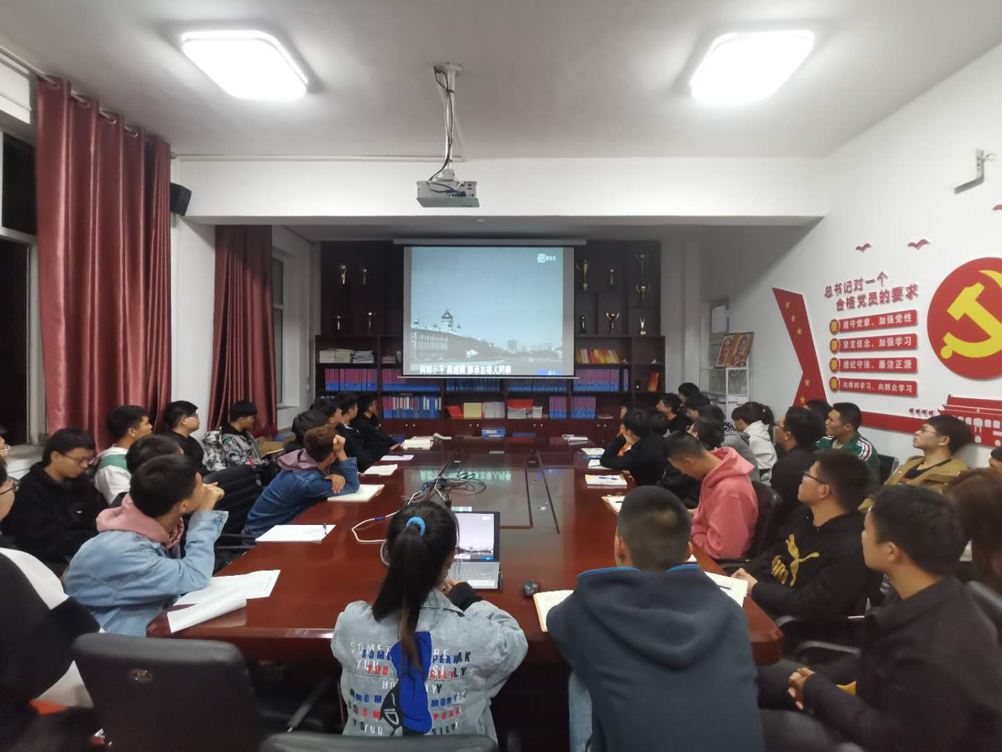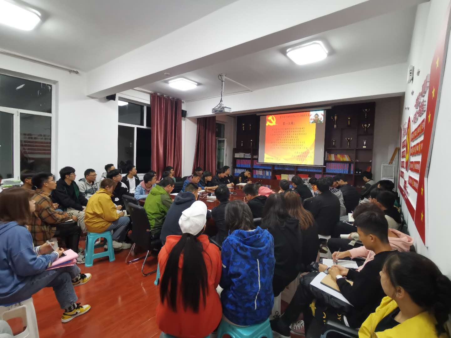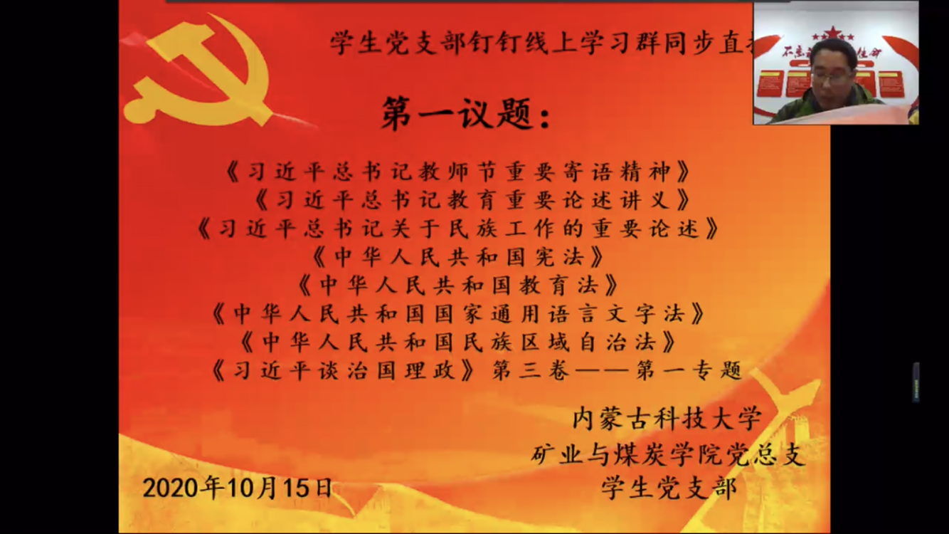 为进一步提高学生爱国主义观念和思想觉悟,矿业与煤炭学院党总支于2020年10月15日晚上19:30,在临曦楼二楼党员之家线上线下同步开展专题理论学习活动。本次学习内容是第一议题:《习近平总书记关于民族工作的重要论述》、《习近平谈治国理政》第三卷、《习近平总书记教师节重要寄语精神》、《习近平总书记教育重要论述讲义》;专题理论:《中华人民共和国宪法》、《中华人民共和国教育法》、《中华人民共和国国家通用语言文字法》、《中华人民共和国民族区域自治法》;爱国主义教育专题:观看《红色之子乌兰夫(上)》。