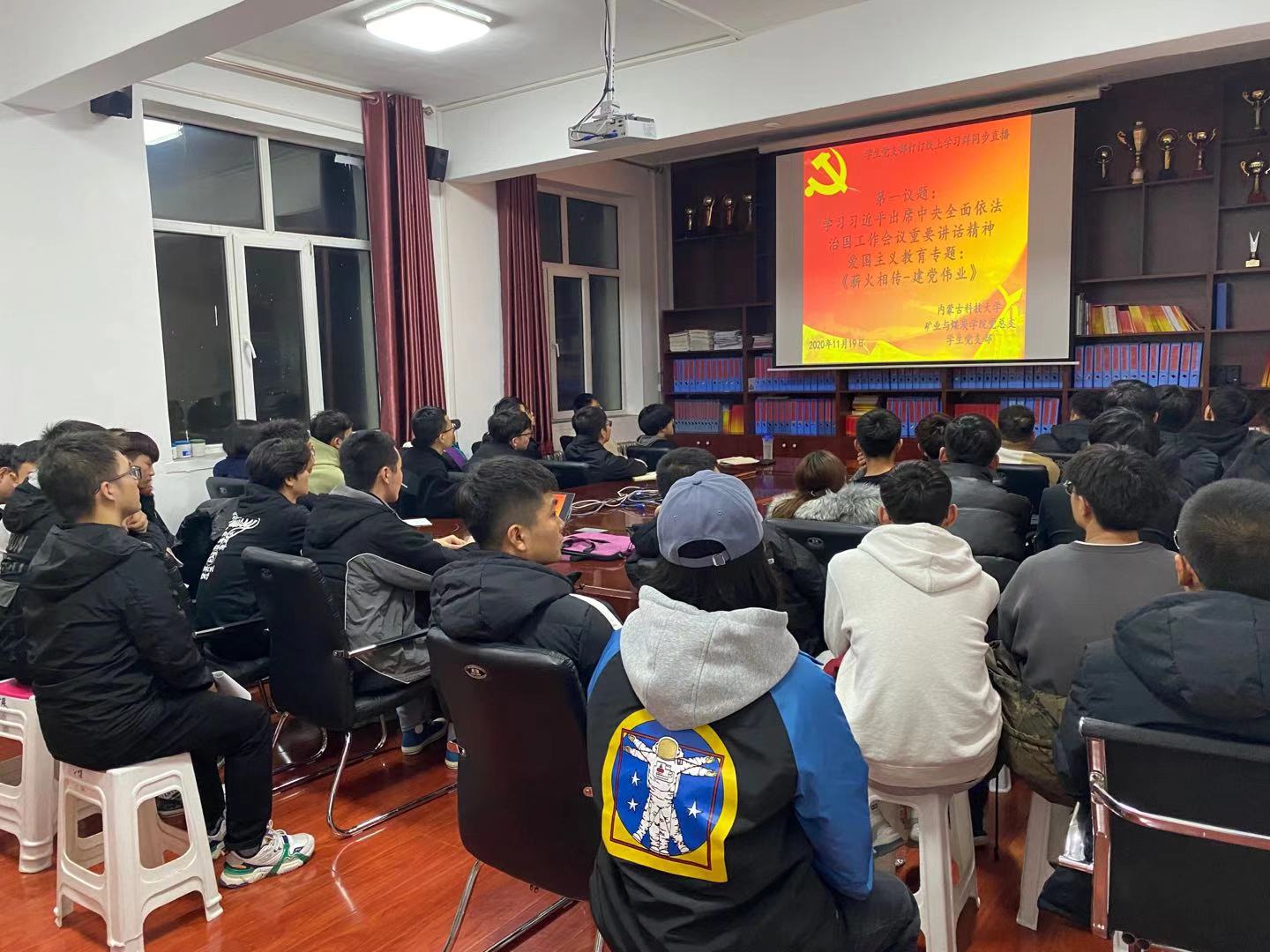 为大力弘扬爱国主义精神,beat365会员官方网站党总支于2020年11月19日晚上19:30,在临曦楼二楼党员之家线上线下同步开展专题理论学习活动。本次学习内容是:第一议题:学习习近平出席中央全面依法治国工作会议重要讲话精神;爱国主义教育专题:观看《薪火相传-建党伟业》视频。