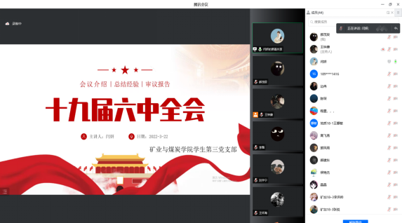 2022年3月22日晚19:30,beat365会员官方网站学生第三党支部于腾讯会议平台召开党员党课学习,本次学习的主题是:学习贯彻党的十九届六中全会精神。领学人:闫妍同志。