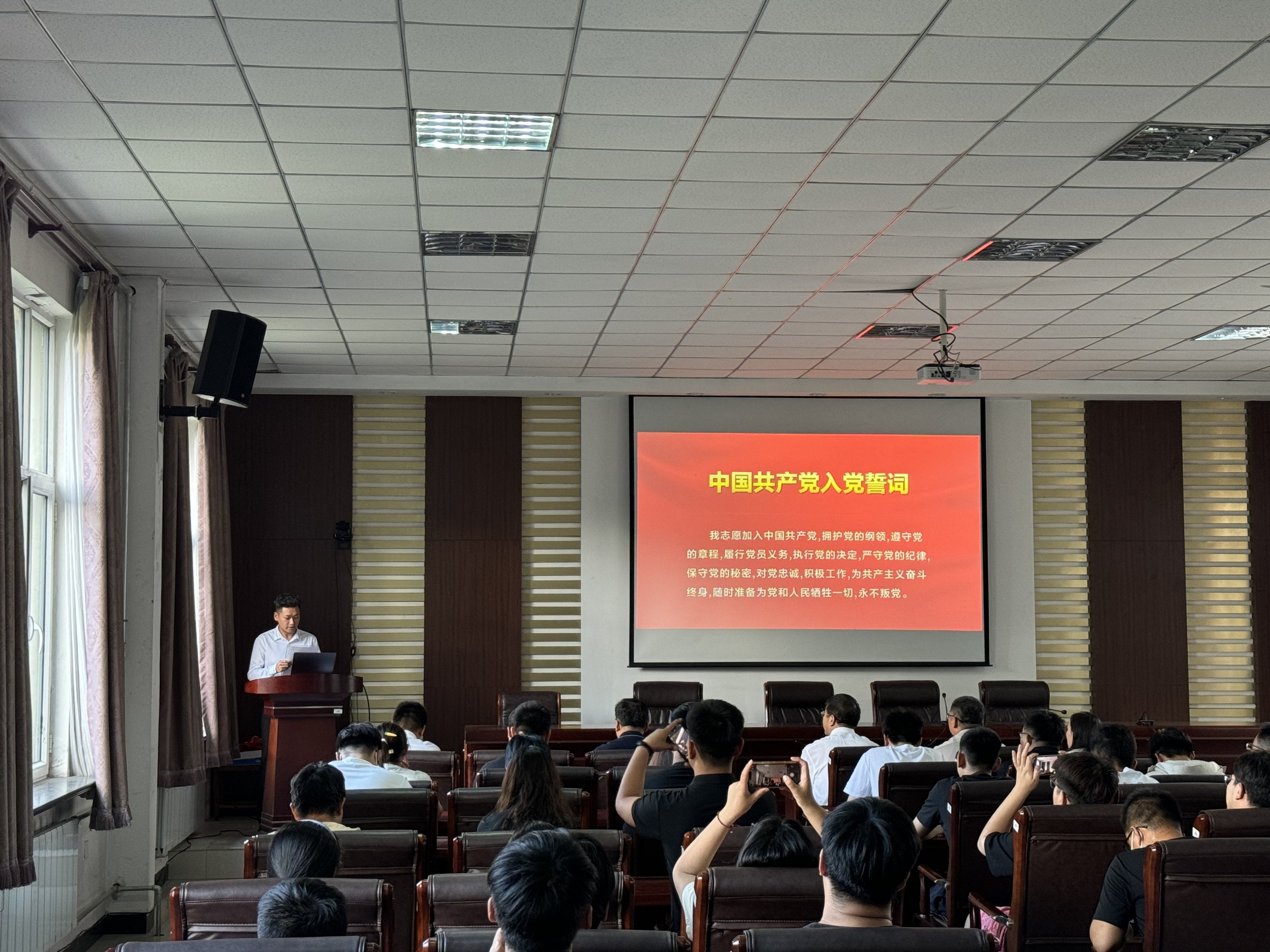 学院党委委员胡显峰带领新党员面向党旗庄严宣誓,其他与会党员重温入党誓词。