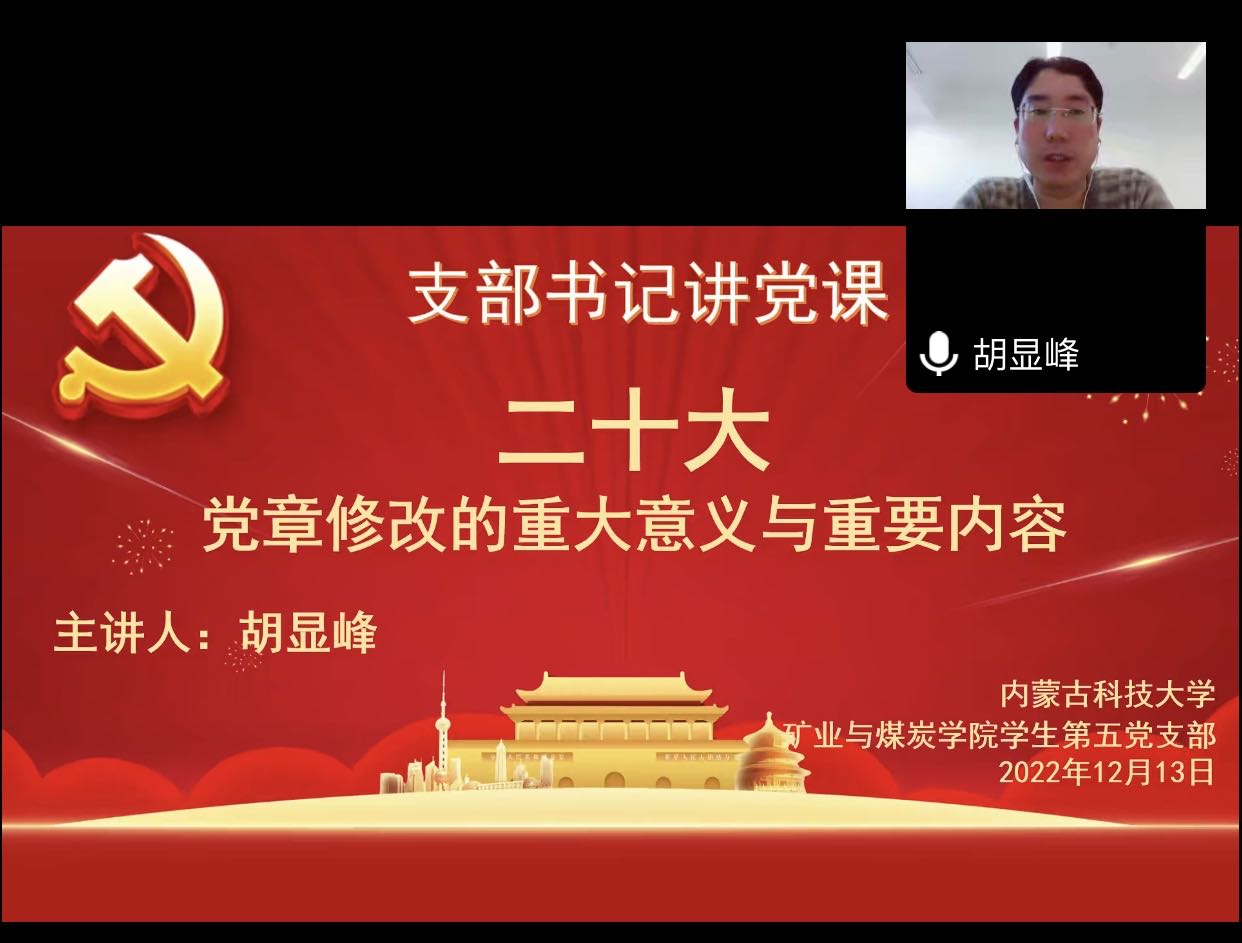 为引导广大党员深入学习贯彻党的二十大精神,更加自觉地学习党章、遵守党章、贯彻党章、维护党章,beat365会员官方网站学生第五党支部于2022年12月13日组织开展支部书记讲党课,党课由支部书记胡显峰主讲,支部全体党员参加学习,本次学习利用腾讯会议线上开展。