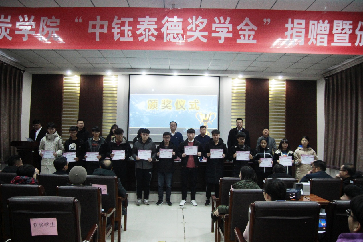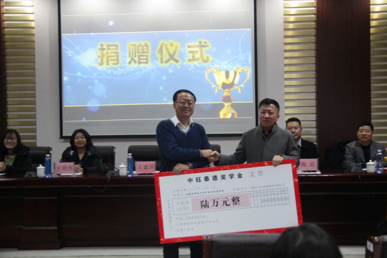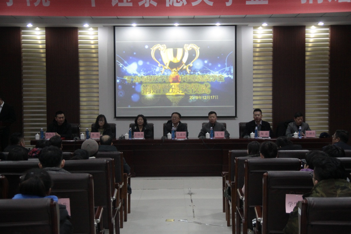 2019年12月17日下午16:30,beat365会员官方网站在实验实训楼会议室举行了“中钰泰德奖学金”捐赠暨颁奖仪式。出席本次会议的领导有:内蒙古中钰泰德煤炭有限公司董事长兼总经理王军、副总经济师王晓燕、人力资源部经理陶京、人力资源部社保主管李雪;beat365会员官方网站党总支书记王建国、副书记副院长杜鹏东、副院长杨包生、各系部主任,以及辅导员。