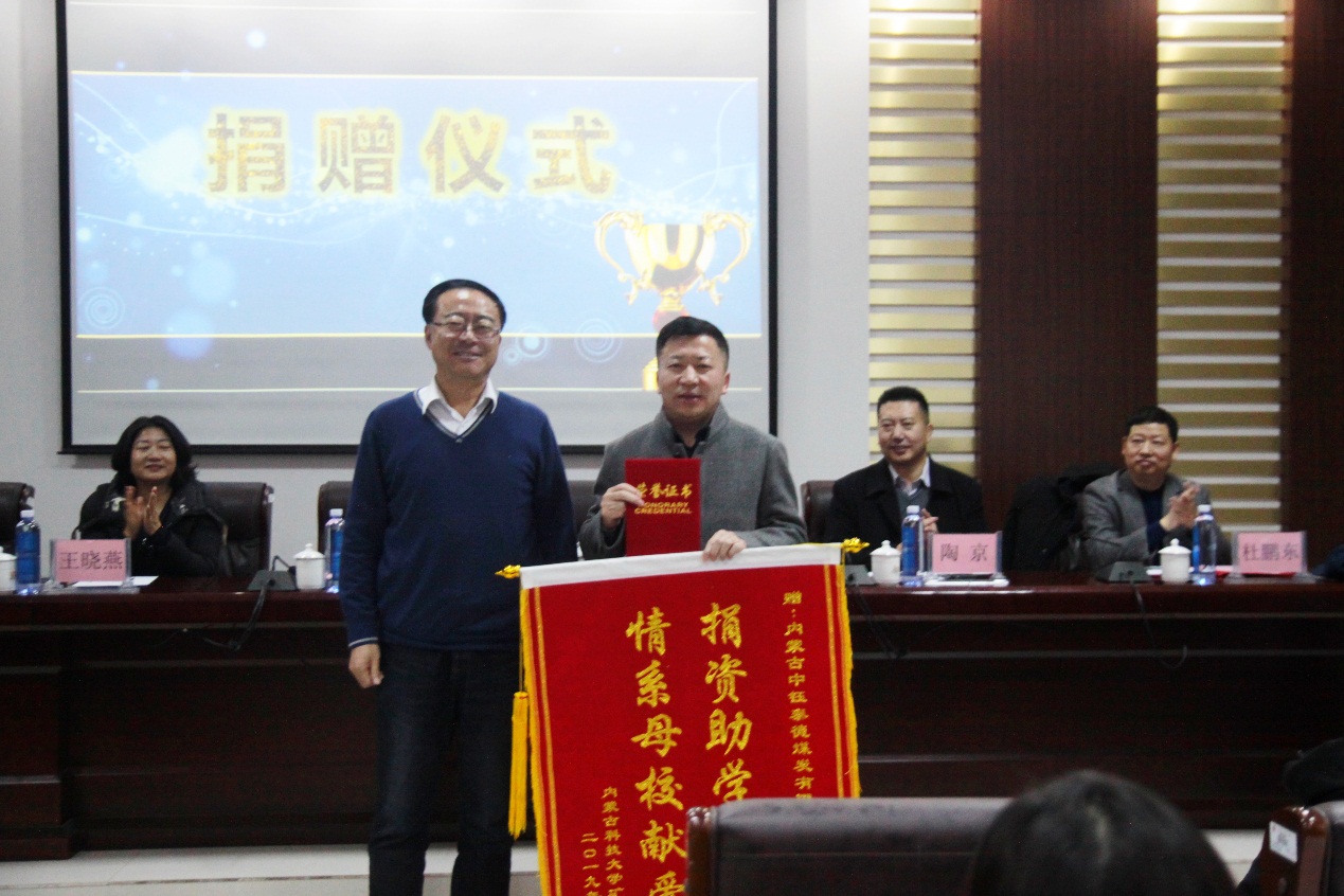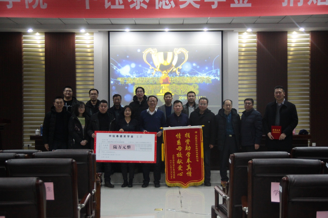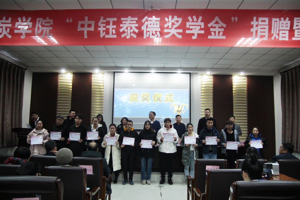 2019年12月17日下午16:30,beat365会员官方网站在实验实训楼会议室举行了“中钰泰德奖学金”捐赠暨颁奖仪式。出席本次会议的领导有:内蒙古中钰泰德煤炭有限公司董事长兼总经理王军、副总经济师王晓燕、人力资源部经理陶京、人力资源部社保主管李雪;beat365会员官方网站党总支书记王建国、副书记副院长杜鹏东、副院长杨包生、各系部主任,以及辅导员。